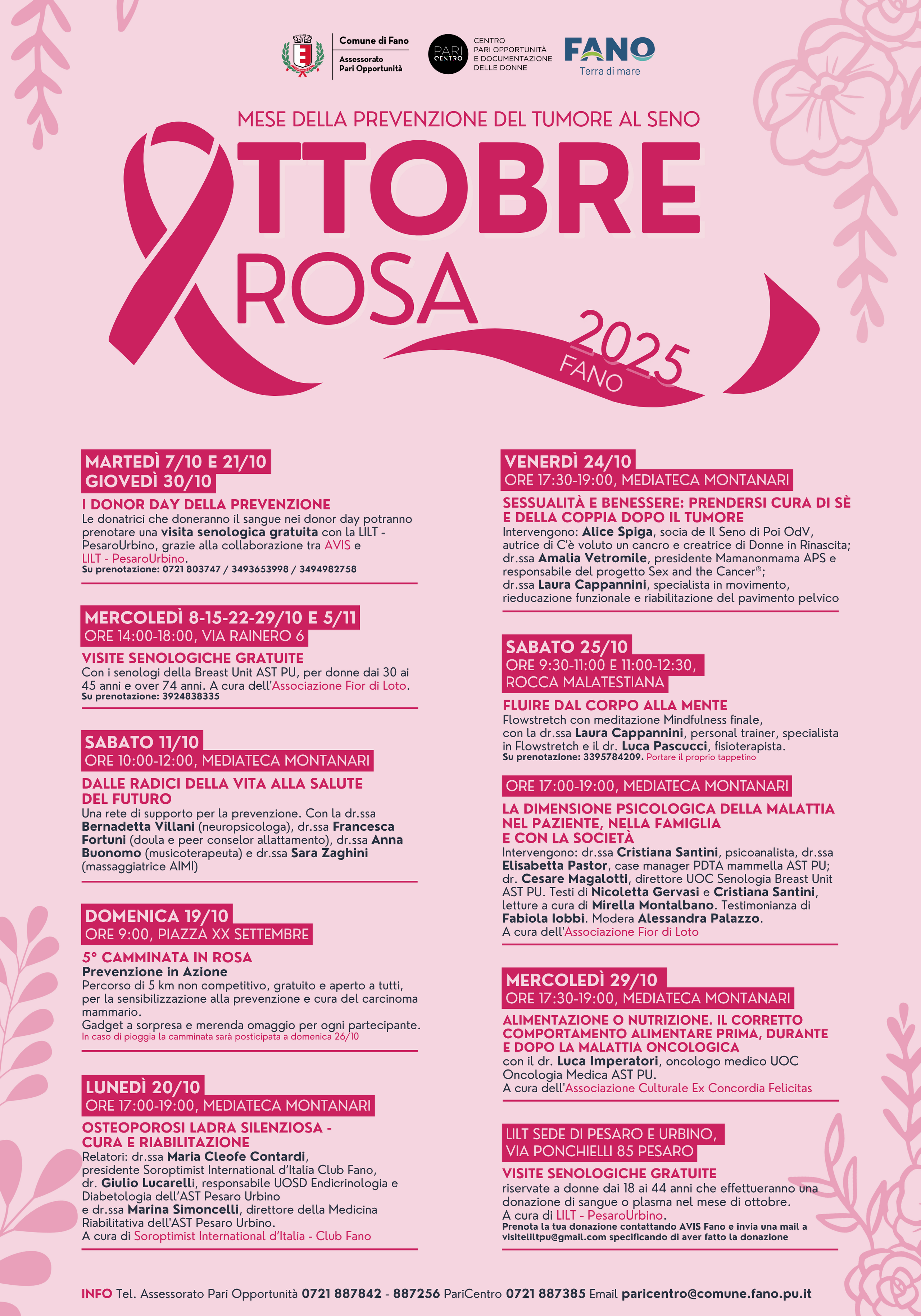 Una rete ampia di associazioni, istituzioni e professionisti della salute si unisce anche quest’anno per l'Ottobre Rosa, il mese dedicato alla prevenzione del tumore al seno. Accanto alla prevenzione primaria e alla diagnosi precoce, l’edizione 2025 pone un’attenzione particolare al recupero del benessere psicofisico dopo l’intervento, coinvolgendo servizi sanitari e sociali in un percorso condiviso con il mondo associativo cittadino.